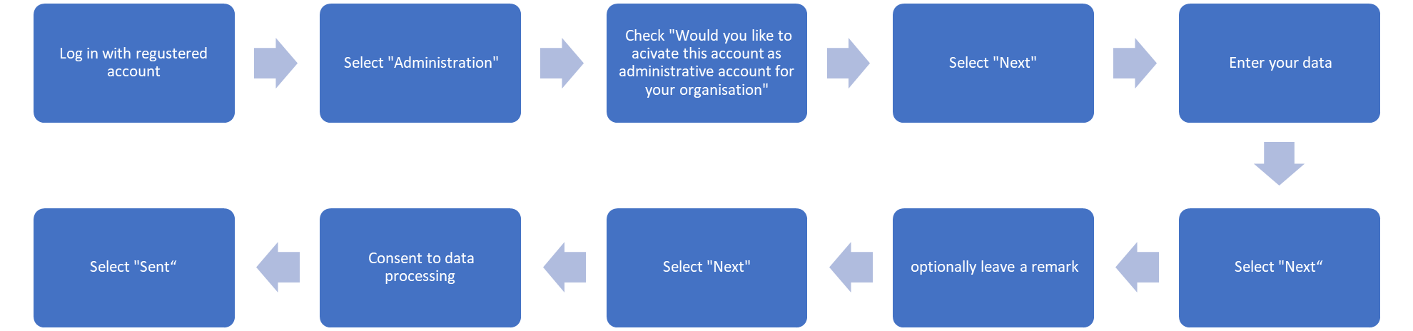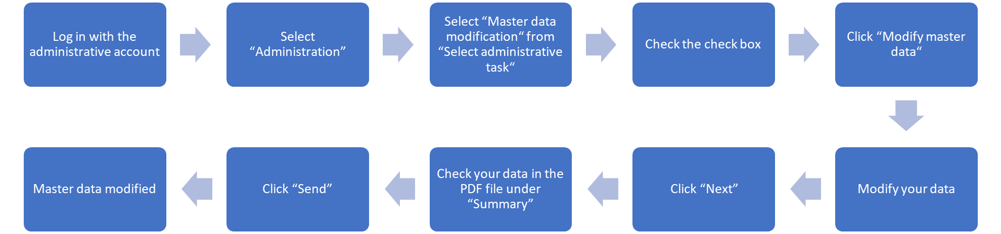 Using the administrative account, each client organisation can maintain its master data as well as add or remove registered user accounts, thereby granting or revoking employee access. Orders and applications for services from the PTB may only be placed using employee accounts that have been assigned to an active administrative account.